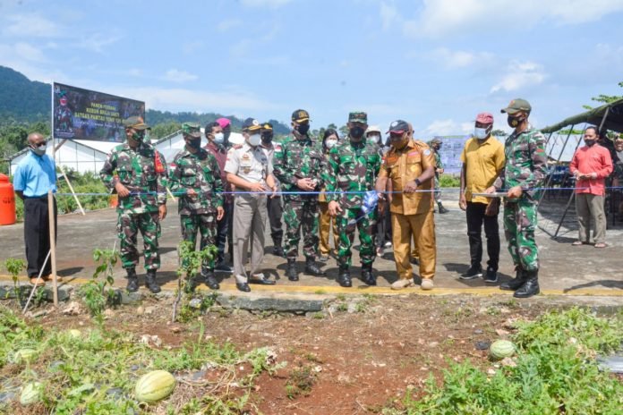 ACTUALNEWS.ID, Jayapura – Komandan Korem (Danrem) 172/PWY Brigjen TNI Izak Pangemanan bersama Dansatgas Pamtas RI-PNG Yonif 131/BRS dan masyarakat perbatasan melakukan panen raya perdana di Kebun Braja Sakti, Skouw Wutung, Distrik Muaratami, Kota Jayapura, Senin (30/8).