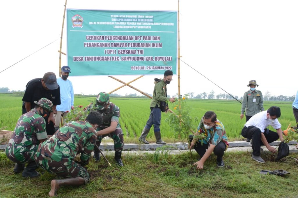 ACTUALNEWS.ID, Boyolali – Dinas Pertanian dan Perkebunan Jawa tengah terus aktif bergerak di lapangan, adapun upaya tersebut dilakukan dengan melaksanakan gerakan pengendalian Organisme Pengganggu Tumbuhan (OPT) dan penanganan Dampak Perubahan Iklim (DPI) di areal seluas 25 hektar (ha), tepatnya di Desa Tanjungsari Kecamatan Banyudono Kabupaten Boyolali, Rabu (26/01/2022).
