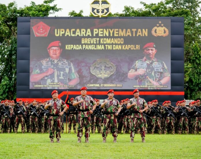 ACTUALNEWS.ID, Jakarta – Kapolri Jenderal Listyo Sigit Prabowo dan Panglima TNI Laksamana Yudo Margono disematkan Baret Merah dan Brevet Komando dari pasukan elite Kopassus.