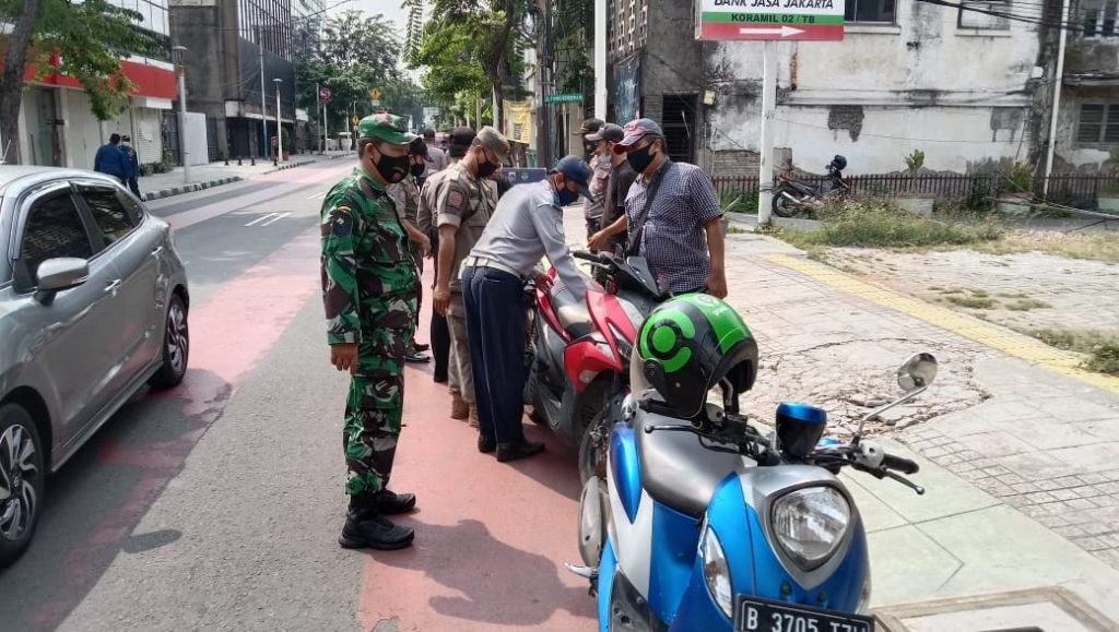 Babinsa Koramil 02/Tambora Kodim 0503/JB Serma Doddy dan Sertu Slamet ST dan Serda Chandra bersama Polsek Tambora,Satpol PP,Damkar dan Dishub menyasar Jl. Kopi RW. 03 Kelurahan Roamalaka Kecamatan Tambora Jakarta Barat dalam operasi yustisi dengan sasaran masyarakat yang tidak patuh protokol kesehatan.