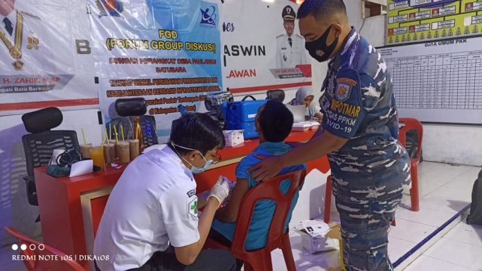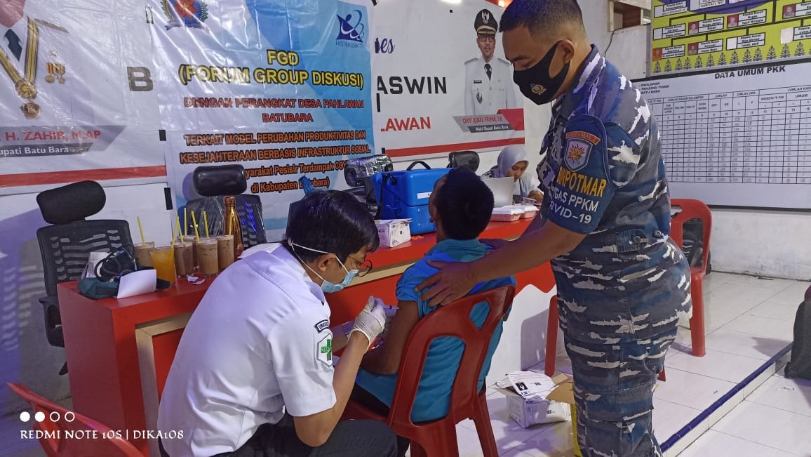 Babinpotmar Posal Tanjung Tiram Kopda Mawardi dampingi 44 orang vaksin Sinovac dengan rincian dosis 1 sebanyak 24 orang dan dosis 2 sebanyak 20 orang di Kantor Desa Pahlawan Tanjung Tiram.