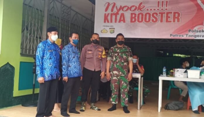 ACTUALNEWS.ID, Kodam Jaya, Tangerang – Babinsa Kel Bambu Apus Serma Sriyadi anggota Koramil 05/Cpt, Kodim 0506/Tgr pantau penerapan protokol kesehatan disaat berlangsung kegiatan vaksinasi di wilayah binaannya.