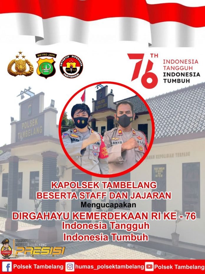 “Kami Keluarga besar Polsek Tambelang, Polres Metro Bekasi menyampaikan Selamat Hari Ulang Tahun Kemerdekaan Republik Indonesia yang ke-76. Semoga bangsa Indonesia tercinta ini lekas bebas dari bahaya pandemi Covid-19 dan bisa kembali beraktifitas seperti biasa,” jelas Kapolsek Tambelang, AKP. Miken Fendriyati, SH,MH.Senin (16/08/2021).