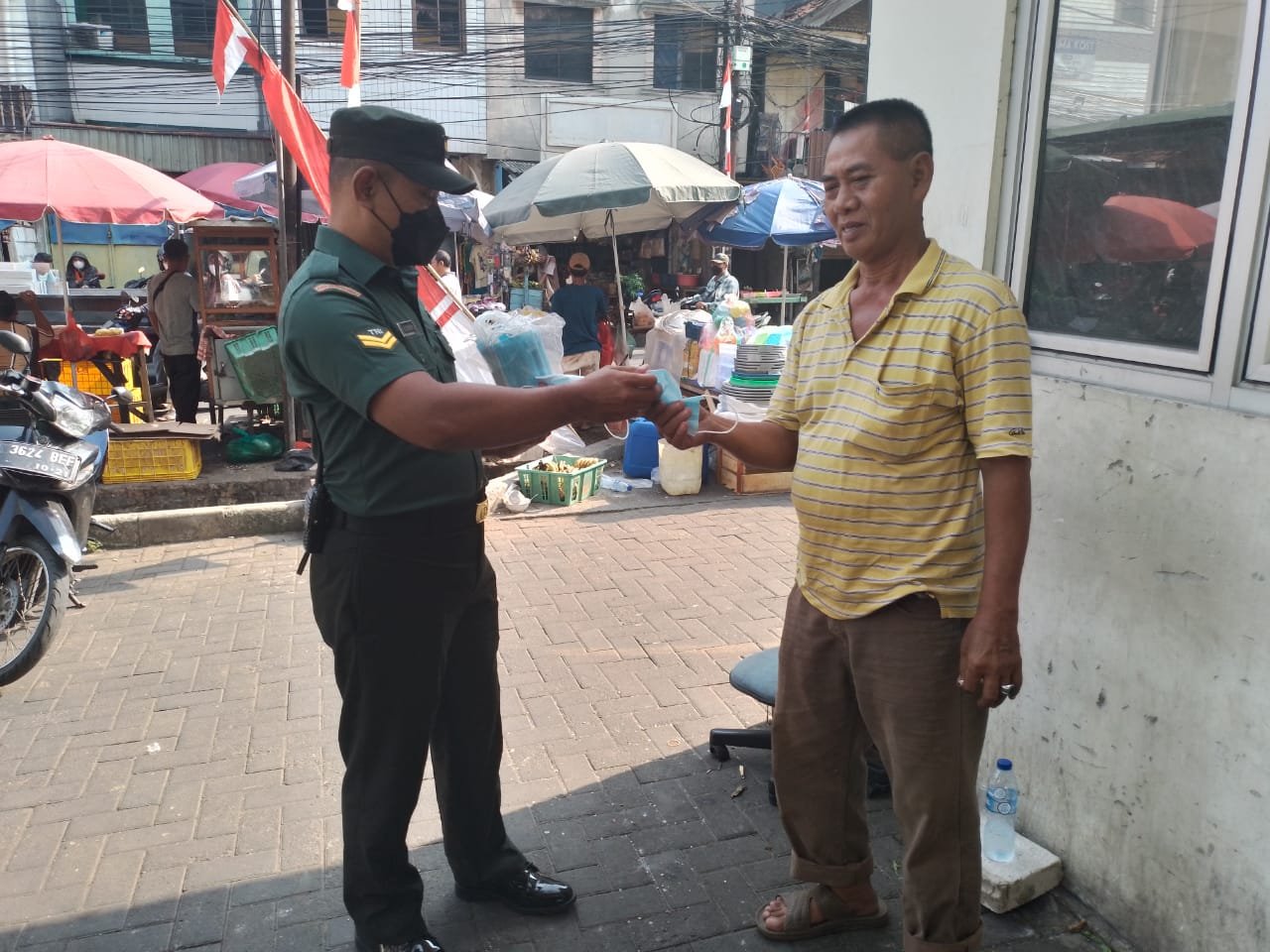 Menurut Babinsa Koramil 01/Tamansari Sertu Kusnudin, sesuai instruksi Danramil, maka kami membagikan masker di PD Pasar Jaya Gg Kancil Jalan Keamanan RT. 014/006 Kel. Keagungan, Kec. Tamansari, Jakarta-Barat.