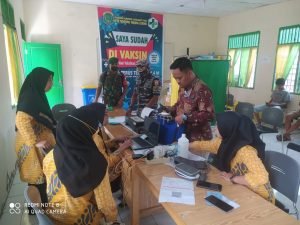 Babinpotmar Posal Sei Berombang Serda Syahbuddin dampingi 100 masyarakat pesisir vaksin Sinovac dengan rincian dosis 1 sebanyak 88 dan dosis 2 sebanyak 12 orang di Puskesmas Sei Berombang Kecamtan Panai Hilir.