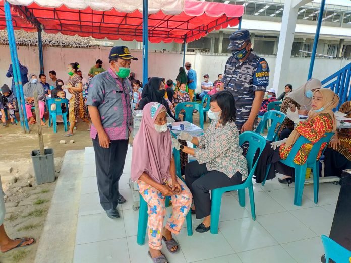 Babinpotmar Posmat Pagurawan Serda Ali Ahmad dampingi 350 warga pesisir vaksin Sinovac dengan rincian dosis 1 sebanyak 261 orang dan dosis 2 sehanyak 89 orang di Puskesmas Pagurawan.
