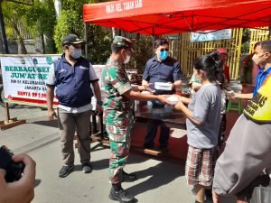 “Kegiatan Jum’at berkah ini kita laksanakan setiap hari Jum’at dengan berpindah-pindah lokasi, yang bertujuan meringankan beban warga masyarakat di masa Pandemik covid-19.”kata Sertu Rusnanto. (Sumber Koramil 01/TS)