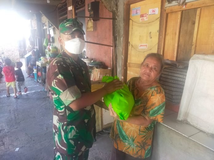 Sertu Suharno menjelaskan, sesuai atensi Danramil, Mayor Infateri Zulkarnaen Galib, maka kami para Babinsa di setiap kelurahan membagikan paket sembako di Jum’at berkah ini kepada warga yang terdapat covid-19 dan kurang mampu.