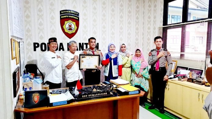 ACTUALNEWS.ID, Serang – Kepala Dinas Pariwisata (Kadispar) Provinsi Banten Drs. M. Agus Setiawan memberikan penghargaan kepada Dirpamobvit Polda Banten Kombes Pol Edy Sumardi di ruang kerjanya pada Jum’at, (21/01).