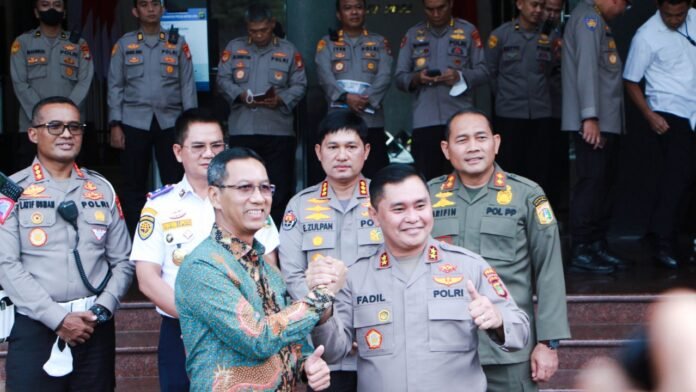 ACTUALNEWS.ID, Jakarta – Irjen Pol. Dr. Mohammad Fadil Imran, M.Si Kapolda Metro Jaya di dampingi Brigjen. Pol. Drs. Hendro Pandowo, M.Si. Wakapolda Metro Jaya menerima kunjungan dari Penjabat Gubernur DKI Jakarta Drs. Heru Budi Hartono M.M., Kamis (20/10/2022).