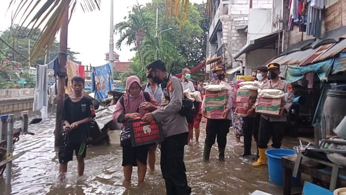 ACTUALNEWS.ID, Jakarta – Kapolsek Sunda Kelapa AKP Seto Handoko memberikan bantuan Sembako kepada warga dan nasi bungkus yang terdampak banjir rob.