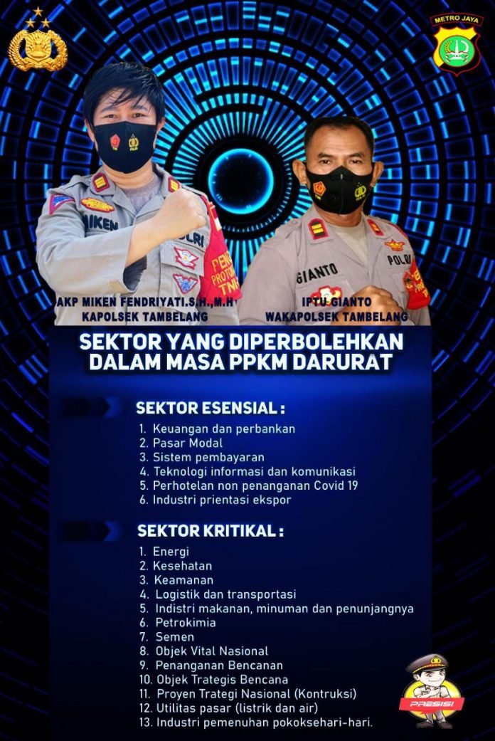 Miken pun minta warga di wilayah hukum Polsek Tambelang-Polres Metro Bekasi jika mengetahui masih ada oknum pelaku usaha non esensial yang sengaja membuka usahanya, segera melapor kepada pihaknya.