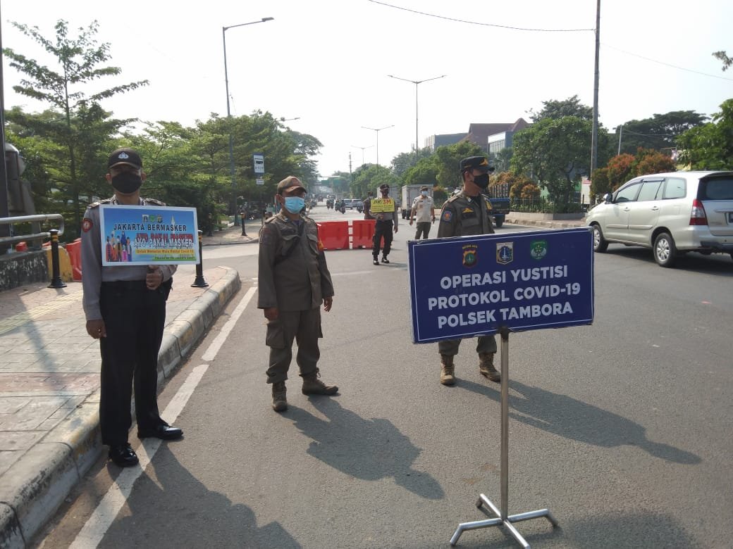 Usai apel kesiapan yang dipimpin Kapolsek Tambora Kompol M.Faruk Rozi, 24 personil gabungan dari, Polsek Tambora, Waka Polsek Akp Risris Priyatna SH, MH, Satpol PP J.Situmorang, Damkar Ahmad Sarbini dan Dishub Edi Kapolsubsektor Jembatan lima Iptu Suparsono, Kapolsubtor Ketapang Iptu Bambang Gunaedi Sabhara Aiptu Purwanta. menyisir pejalan kaki dan pengendara yang tidak menggunakan masker di RPTRA Kali Jodo Jalan PTB. Angke Kelurahan Angke, Kecamatan Tambora, Jakarta Barat.