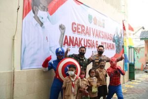 Area vaksin sengaja dilakukan dekorasi sedemikian rupa agar anak-anak merasa senang/gembira saat pelaksanaan vaksinasi. Selain itu disiapkan juga Badut karakter avanger Spidermen dan Captain Amerika.