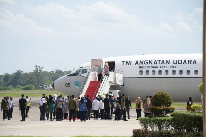 Kedatangan RI 3 Ibu Hj. Iriana Joko Widodo dan RI 4 Ibu Hj. Wury Ma’ruf Amin beserta rombongan dengan menggunakan Pesawat Boeing 737-400 Reg. A-7305 milik TNI AU dalam rangka Kunjungan Kerja terkait kegiatan Organisasi Aksi Solidaritas Era Kabinet Indonesia Maju (OASE-KIM) di Kota Palembang Provimsi Sumatera Selatan.