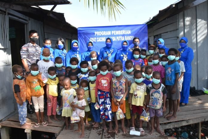 Kunjungan tersebut adalah dalam rangka program pemberian obat cacing kepada anak-anak Putra Bangsa binaan Lantamal XI Merauke yang memang berdomisili disekitar Mako Lantamal XI Merauke dan didampingi oleh tim medis dari Diskes Lantamal XI Merauke.
