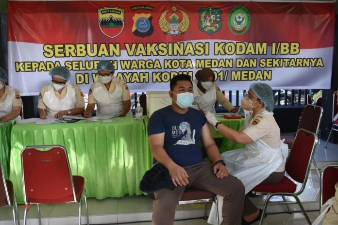 ACTUALNEWS.ID,. Jakarta – Untuk mempercepat mewujudkan Herd Immunity dan sukseskan program vaksinasi kepada warga masyarakat Kota Medan, maka Komando Daerah Militer I Bukit Barisan kembali meningkatkan kegiatan serbuan vaksinasi TNI di Lapangan Benteng Medan, Sabtu (17/7/2021).