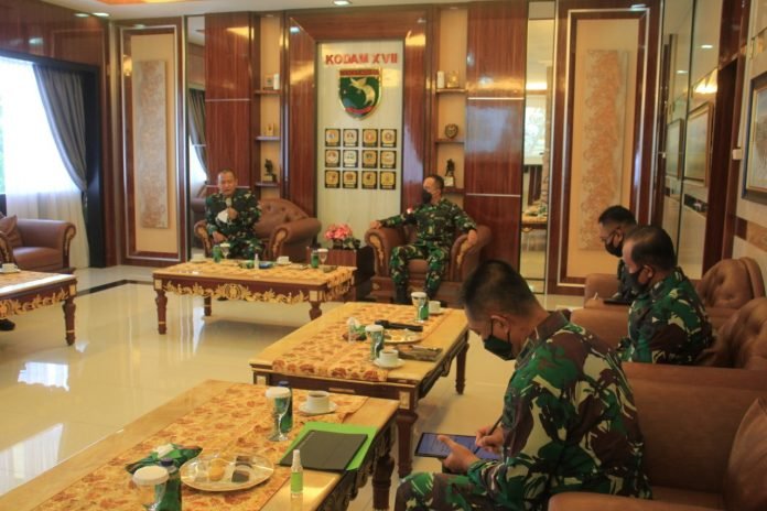 ACTUALNEWS.ID, Papua – Pangdam XVII/Cenderawasih Mayjen TNI Ignatius Yogo Triyono, M.A yang diwakili oleh Kasdam XVII/Cenderawasih Brigjen TNI Bambang Trisnohadi menerima kunjungan kerja Kaskogabwilhan lll Laksamana Muda TNI Maman Firmansyah di ruang Cycloops Makodam XVII/Cenderawasih, Senin (20/9/2021).