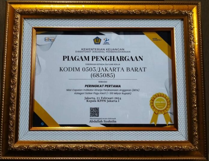 Dalam kegiatan tersebut Kodim 0503/JB menerima penghargaan Peringkat 1 Nilai IKPA tertinggi Kategori Nilai IKPA Satker Pagu sampai dengan 100 Milyar diantara 50 Satker Mitra Kerja KPPN Jakarta.ACN/Pendim 0503/JB