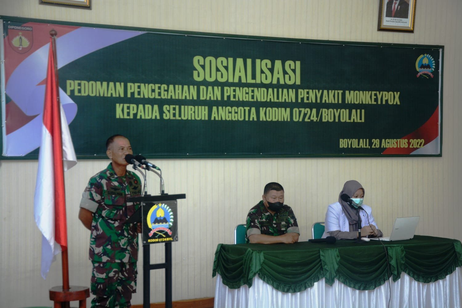 Kodim 0724/Boyolali melalui perintah Dandim 0724/Boyolali Letkol Arm Ronald F Siwabessy, M.A, melaksanakan Sosialisasi dan Edukasi pedoman pencegahan dan pengendalian penyakit monkeypox kepada seluruh anggota Kodim 0724/Boyolali yang bertempat di Aula Makodim Boyolali Jalan Padanaran Desa Tegalmulyo Kecamatan Mojosongo Kabupaten Boyolali. Senin( 29/8/22).