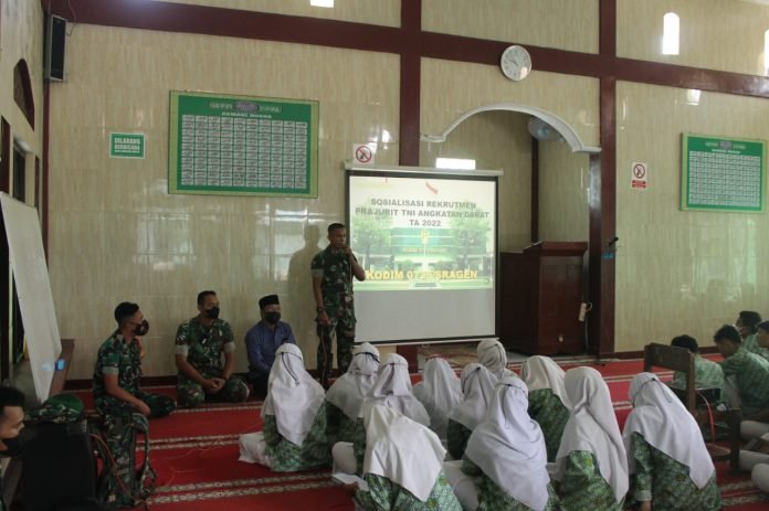 Kegiatan sosialisai perekrutan calon Prajurit TNI-AD yang dilakukan oleh Kodim Sragen beserta jajarannya merupakan rangkaian dari kegiatan yang sudah terprogram sebagai bagian dari tugas Aparat Komando Kewilayahan, dalam memberikan wawasan tentang penerimaan calon prajurit TNI, terutama di wilayah teritorial Kodim 0725/Sragen.