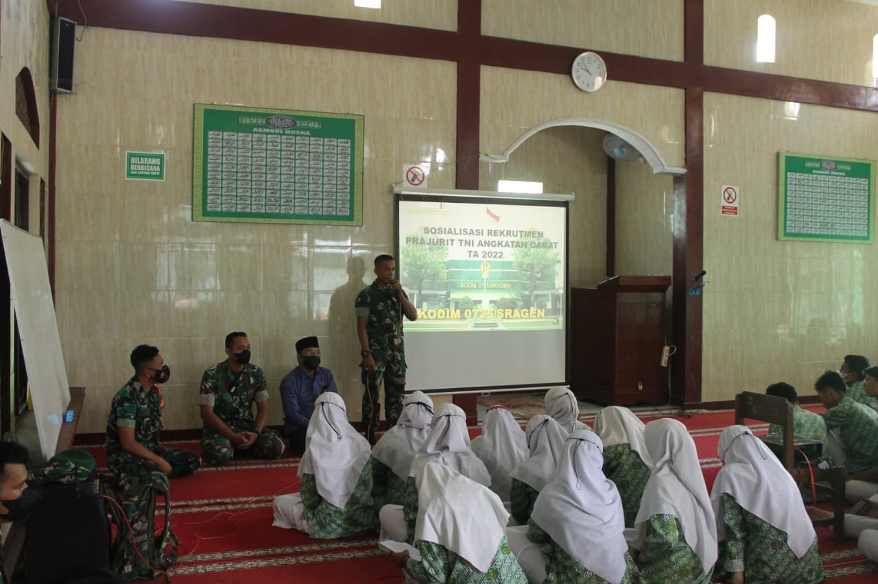 Kegiatan sosialisasi dalam rangka perekrutan dan penerimaan calon Prajurit TNI-AD kali ini diikuti 263 siswa dan siswi Sekolah MAN 2 Sragen Kec. Plupuh Kab. Sragen, diharapkan dengan adanya sosialisasi ini, dapat menarik minat kaum muda untuk menjadi bagian sebagai anggota TNI khususnya TNI-AD