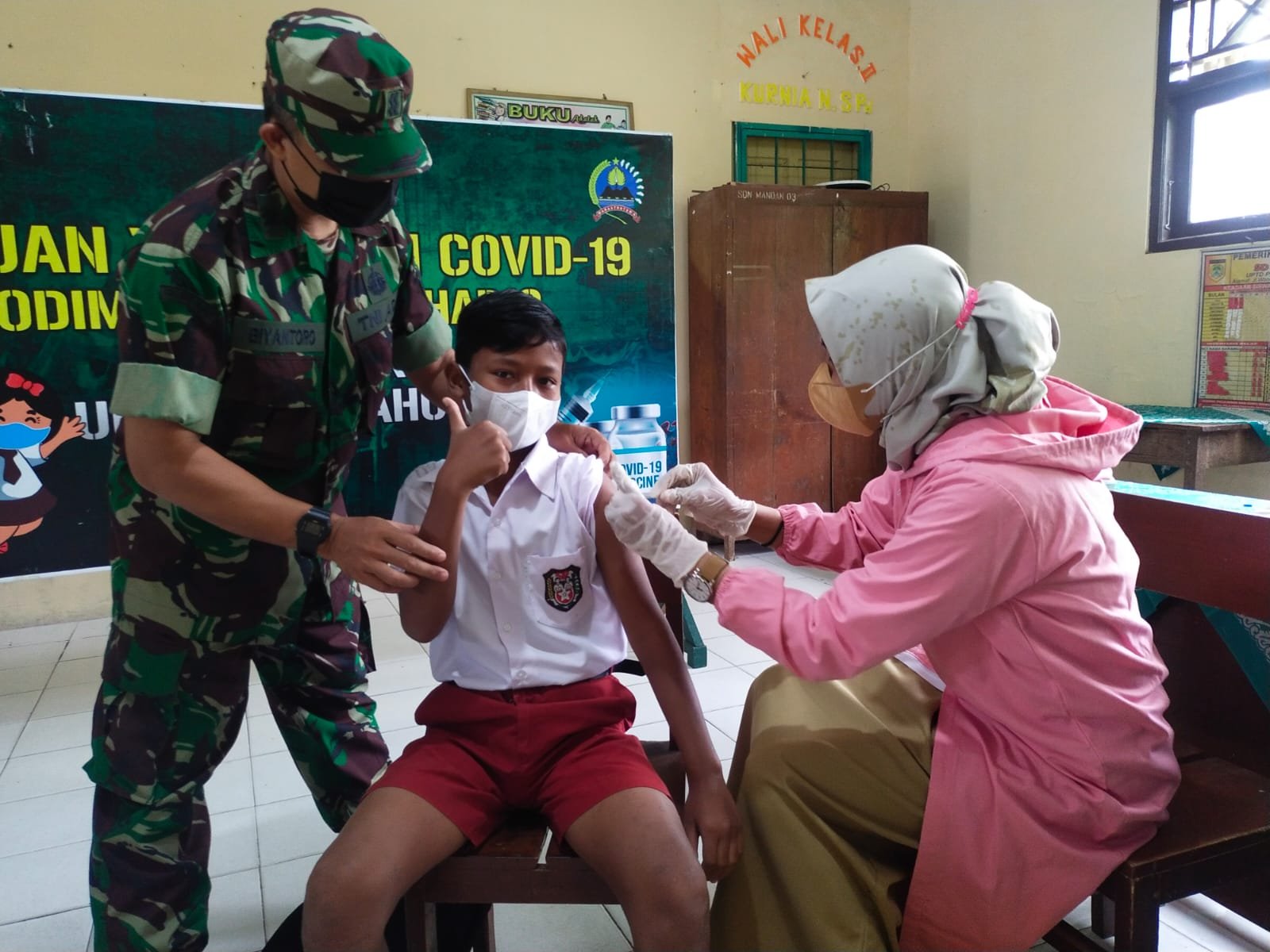 “Vaksinasi untuk anak-anak usia 6-11 tahun ini juga sebagai upaya percepatan pencapaian target kekebalan di tingkat Sekolah Dasar/Madrasah ibtidaiyah dan kelompok di lingkungan masyarakat,” tukas Dandim.