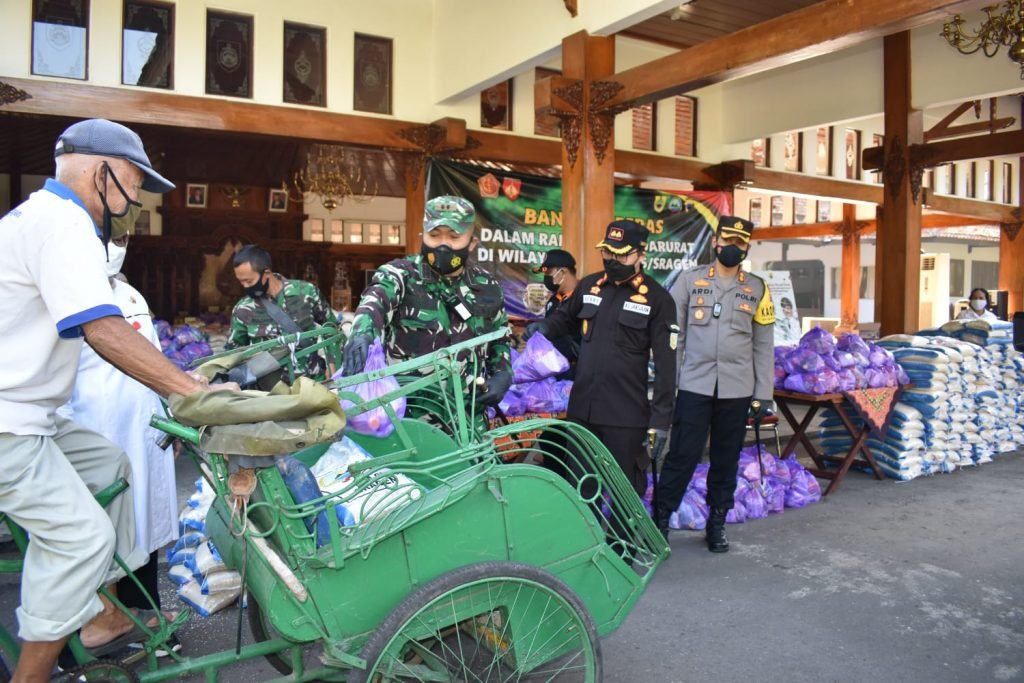 Dandim mengatakan “Kodim 0725/Sragen Bekerjasama dengan Pemkab Sragen hari ini memberikan bantuan sembako kepada PKL Dan pengemudi becak Sragen, selain pembagian di pendopo rumah dinas Bupati sebanyak 1622 paket juga dilaksanakan di kantor Dishub Sragen sebanyak 350 Paket sembako untuk pengemudi becak motor dan becak kayuh, sehingga total pembagian paket sebanyak 1972”