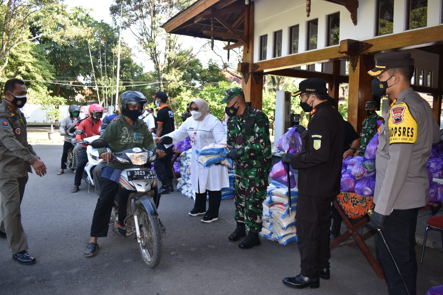 Dandim mengatakan “Kodim 0725/Sragen Bekerjasama dengan Pemkab Sragen hari ini memberikan bantuan sembako kepada PKL Dan pengemudi becak Sragen, selain pembagian di pendopo rumah dinas Bupati sebanyak 1622 paket juga dilaksanakan di kantor Dishub Sragen sebanyak 350 Paket sembako untuk pengemudi becak motor dan becak kayuh, sehingga total pembagian paket sebanyak 1972”