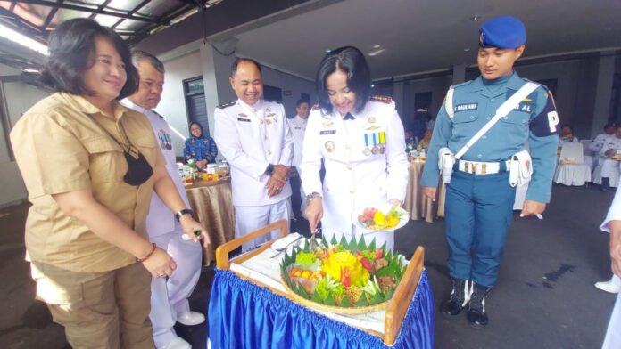Selain pengguntingan pita juga dilaksanakan pemotongan tumpeng kegiatan peresmian Kantin Sauyunan Primkopal Lanal Bandung.