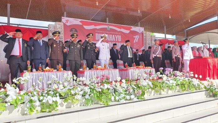 ACTUALNEWS.ID, Simeulue, 21 Agustus 2022,– Komandan Lanal Simeulue Letkol Laut (P) Hendra Dwinanto, S.H., M.Tr.Opsla., didampingi Ketua Cabang 8 Korcab I DJA I Ibu Alin Hendra Dwinanto menghadiri upacara penaikan dan penurunan Bendera Merah Putih dalam rangka memperingati HUT Ke-77 RI di Lapangan Pendopo Kabupaten Simeulue, Rabu (17/08/2022).