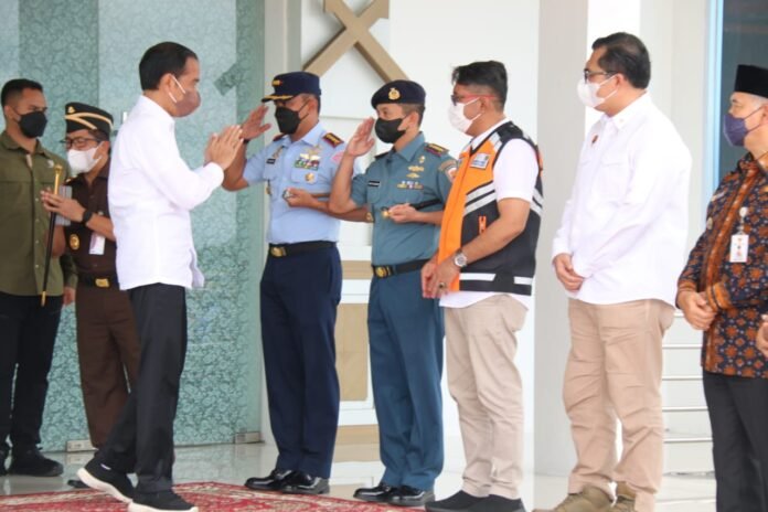 ACTUALNEWS.ID, Jambi – Komandan Pangkalan TNI Angkatan Laut Palembang Kolonel Laut (P) Widyo Sasongko bersama Forum Koordinasi Pimpinan Daerah (FKPD) Provinsi Jambi menyambut kedatangan Presiden Joko Widodo beserta Ibu Hj. Iriana Widodo beserta Rombongan di VIP Room Bandar Udara Sultan Thaha Saifuddin, Kota Jambi, Kamis (7/4/2022).