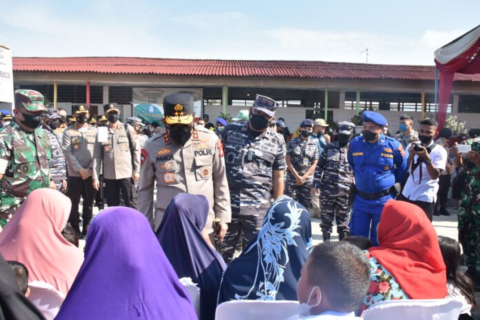 Dengan menggunakan Sea Rider, Komandan Lantamal I Laksamana Pertama TNI Johanes Djanarko Wibowo bersama Kapolda Sumatera Utara Irjen Pol RZ Panca Putra Simanjuntak beserta Pejabat Utama Lantamal I dan Polda Sumatera Utara meninjau langsung pelaksanaan Serbuan vaksinasi Maritim dan pembagian sembako di Kampung Nelayan Pelangi Belawan yang menargetkan 500 orang tervaksin baik vaksin pertama, kedua, maupun booster.