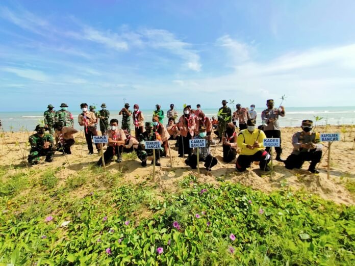ACTUALNEWS.ID, Tuban – Komando Rayon Militer (Koramil) 0811/12 Bancar melaksanakan penghijauan penanaman 1000 batang bibit mangrove untuk mengatasi abrasi laut, kegiatan ini merupakan implementasi dari program Pembinaan Lingkungan Hidup Tahun 2022 Kodim 0811 Tuban, yang mana diselenggarakan di Desa Margosuko, Kecamatan Bancar, Kabupaten Tuban, Jum’at (08/04/2022).