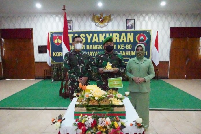 Tasyakuran HUT Ke-60 Korem 071/Wijayakusuma, dilaksanakan dengan tetap menerapkan Protokol Kesehatan dimasa pandemi Covid-19. Ditandai dengan dilaksanakannya pemotongan tumpeng oleh Danrem 071/Wijayakusuma Kolonel Inf Dwi Lagan Safrudin, S.I.P., dengan didampingi Ketua Persit Kartika Chandra Kirana Koorcab Rem 071 PD IV/Diponegoro Ny. Dewi Lagan Safrudin, selanjutnya potongan tumpeng tersebut di berikan kepada prajurit tertua Korem 071/Wijayakusuma Peltu Sudiyo Ba Intelrem 071/Wijayakusuma yang sudah purna tugas. Selain itu, dilaksanakannya pemotongangan kue oleh Ketua Persit Kartika Chandra Kirana Koorcab Rem 071 PD IV/Diponegoro Ny. Dewi Lagan Safrudin, yang selanjutnya diberikan kepada Danrem 071/Wijayakusuma Kolonel Inf Dwi Lagan Safrudin, S.I.P.