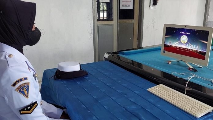 ACTUALNEWS.ID, Sabang – Bertempat di Kantor Satkom Lanal Sabang, Jalan Yos Sudarso, Gampong Kuta Ateuh, Kecamatan Sukakarya, Kota Sabang, Prajurit Kowal Lanal Sabang Serda (Apm/W) Zakzatul Iradhah yang sehari-hari bertugas di Balai Pengobatan Lanal Sabang mengikuti vicon HUT Ke-59 Korps Wanita Angkatan Laut Tahun 2022 yang dipusatkan di Markas Besar Angkatan Laut (Mabesal), Cilangkap, Jakarta Timur, Rabu (05/01/2022).