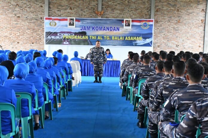 ACTUALNEWS.ID, Tanjung Balai,- Prajurit Lanal Tanjung Balai Asahan dan Jalasenastri Cabang 7 Korcab I DJA I saat menerima arahan Komandan Letkol Laut (P) Aan Prana Tuah Sebayang, S.E., D.W.C. didampingi Ketua Cabang 7 Korcab I DJA I Ny. Elisa Aan Sebayang pada Jam Komandan di Gedung Serba Guna Mako Lanal Tanjung Balai Asahan, Jumat (24/6/2022).