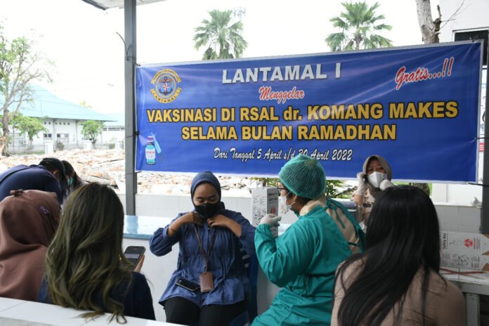 ACTUALNEWS.ID, Belawan – Pangkalan Utama TNI Angkatan Laut I (Lantamal) terus mendukung program pemerintah untuk menuntaskan Covid-19 dengan memanfaatkan momentum bulan Ramadhan 1443 Hijriah, tenaga kesehatan Dinas Kesehatan (Diskes) Lantamal I terus menggencarkan serbuan vaksinasi covid-19, tidak hanya bersifat mobile maupun door to door namun juga pemberian vaksinasi yang bersifat menetap atau stand by di tempat, hal ini terlihat saat personel dari yang terus menggelar vaksinasi di Rumah Sakit TNI Angkatan Laut (RSAL ) Komang Makes, Medan Belawan, Selasa (05/04/2022).