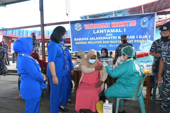 ACTUALNEWS.ID, Belawan – Pangkalan Utama TNI Angkatan Laut (Lantamal) I Belawan terus mengencarkan serbuan vaksinasi covid-19 bagi masyarakat maritim, kali ini Lantamal I menerjunkan tenaga kesehatannya untuk menggelar kegiatan vaksinasi bagi masyarakat pesisir di Dermaga Umum Gabion, Medan Belawan, Jumat (25/03/2022).