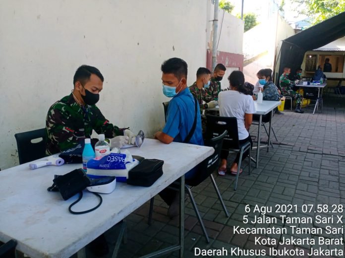 ACTUALNEWS.ID, Jakarta Barat – Serbuan Vaksinasi di wilayah Kodim 0503/ Jakarta Barat setiap harinya gencar di laksanakan dalam rangka membantu Program Vaksinasi Nasional. Seperti yang dilakukan oleh Koramil 01/Tamansari hari Jumat (06/8/2021), yang melaksanakan serbuan vaksin bertempat di halaman parkir Stadion Sepak Bola Tamansari, Jalan Mangga Besar VI Utara, RT. 008/01, Kel. Tamansari Kec. Taman Sari, Kota Administrasi Jakarta Barat.