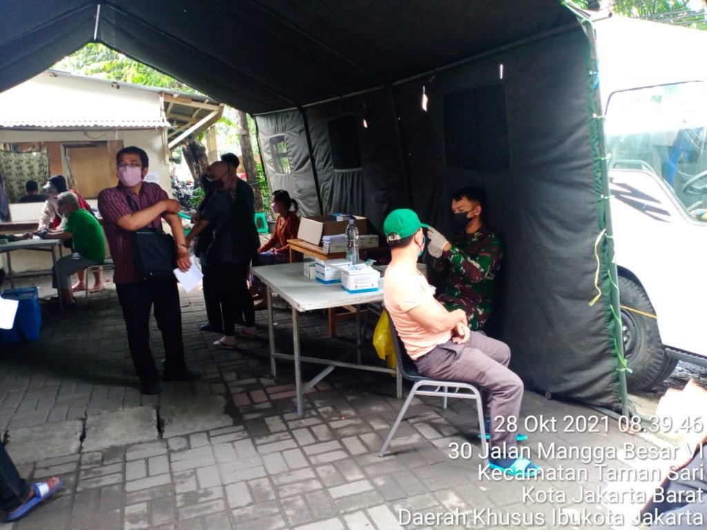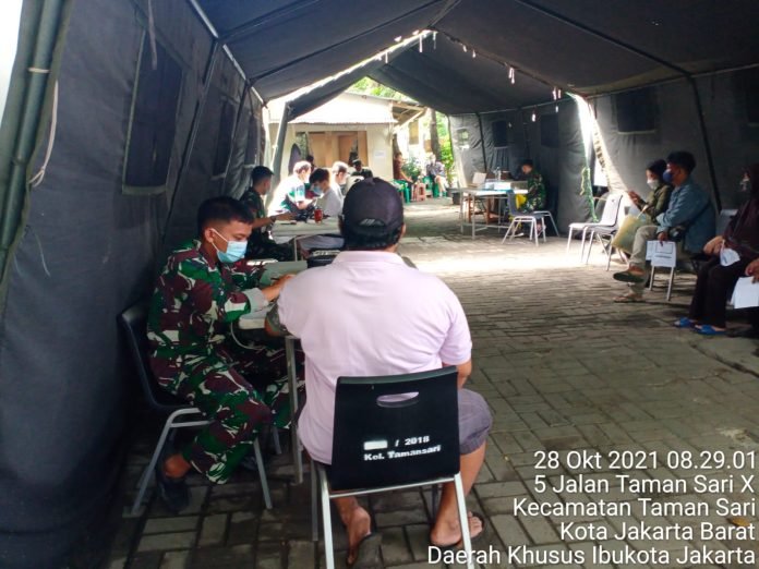 ACTUALNEWS.ID, Jakarta Barat – Dukung program pemerintah dalam Percepatan Penanganan Covid – 19 di serbuan vaksinasi TNI Kodim 0503/Jakarta Barat yang di gelar Koramil 01/Tamansari di Stadion sepak bola Tamansari Jalan Mangga Besar VI Utara, Rt. 08/01, Kelurahan Tamansari, Kecamatan Tamansari berjalan lancar hingga selesai dengan target 100 orang meskipun cuaca mendung.