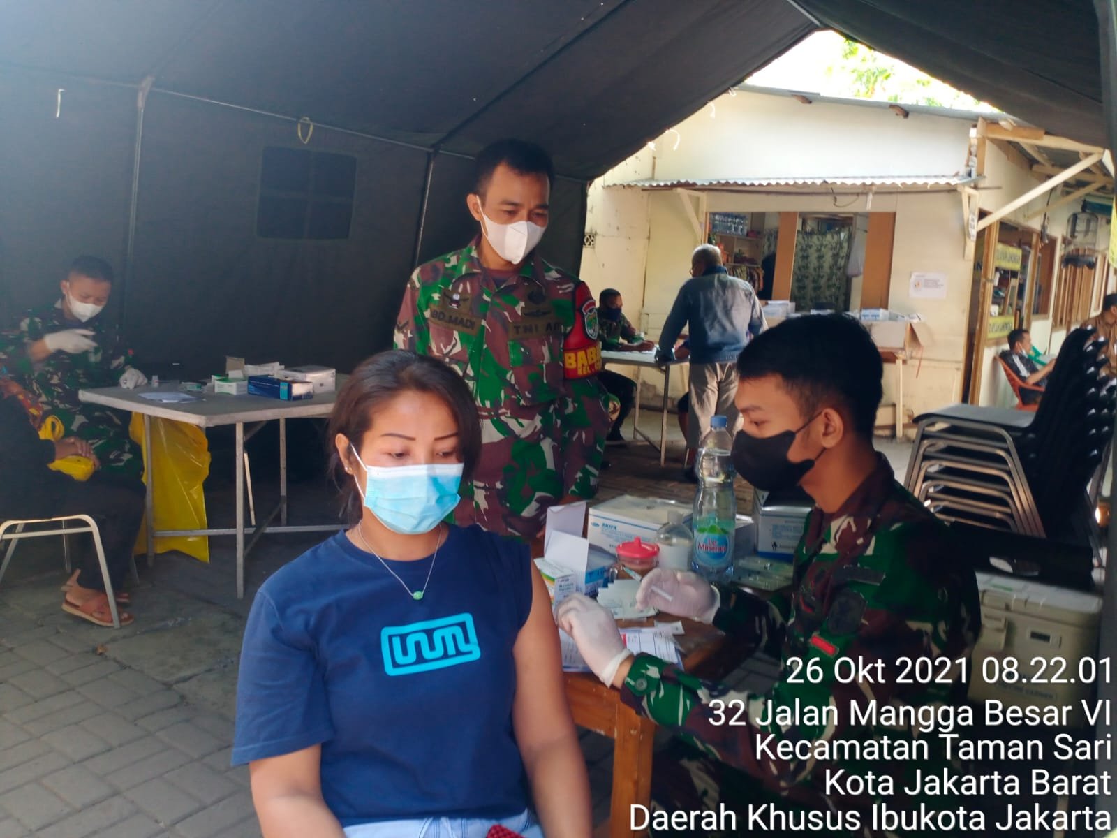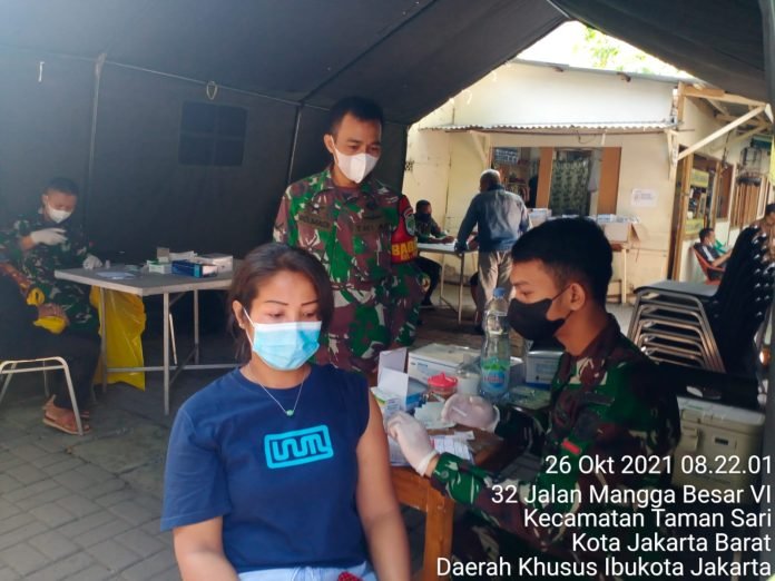 ACTUALNEWS.ID, Jakarta Barat – Tenaga Kesehatan (Nakes) BKO Yonkav 9/SDK bersama Nakes Puskesma Tamansari hari ini, Selasa, 26 Oktober 2021 melayani warga masyarakat dengan memvaksinasi 207 masyarakat di serbuan vaksinasi TNI, Kodim 0503/Jakarta Barat yang gelar Koramil 01/Tamansari.
