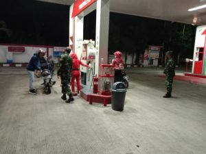 Serma Toni Martin menyampaikan informasi sesuai protokoler pencegahan penyebaran covid-19 antara lain edukasi kepada masyrakat yang akan mengisi bahan bakar di SPBBU tersebut khususnya bagi masyarakat yang tidak menggunakan masker saat mengendarai kendaraan.