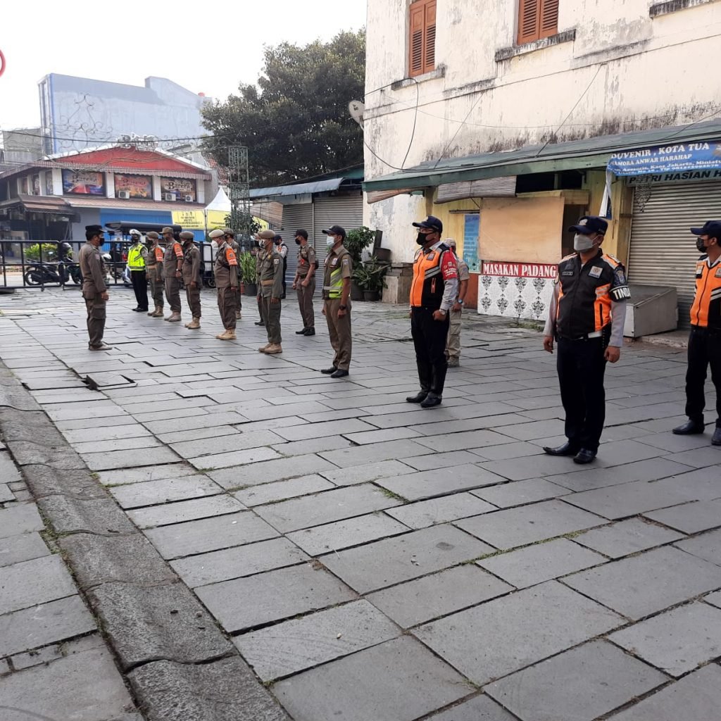 Kegiatan Operasi yustisi diawali dengan apel kesiapan dipimpin Asmar Panjaitan Manpol PP Kecamatan Tamansari dengan Lokasi Apel di Posko Covid-19 Kawasan Kota Tua Jl. Kunir Kelurahan Pinangsia Kecamatan Tamansari Jakarta Barat.
