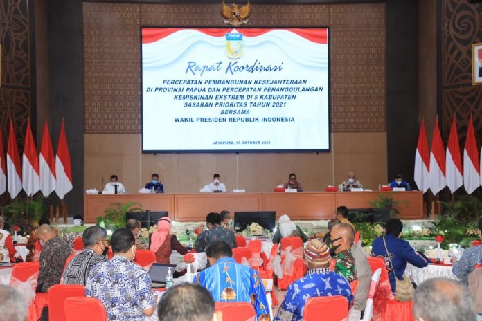 Setelah meninjau GKI Pniel, Wapres RI menuju Aula Sasana Krida Kantor Gubernur untuk melaksanakan Rapat Koordinasi dengan Forkopimda Pemerintah Provinsi Papua dan Forkopimda Pemerintah Daerah beberapa Kabupaten serta sejumlah tokoh masyarakat. Adapun agenda yang dibahas diantaranya adalah pembahasan tentang kemiskinan ekstrim dan percepatan pembangunan kesejahteraan di sejumlah wilayah di Papua.