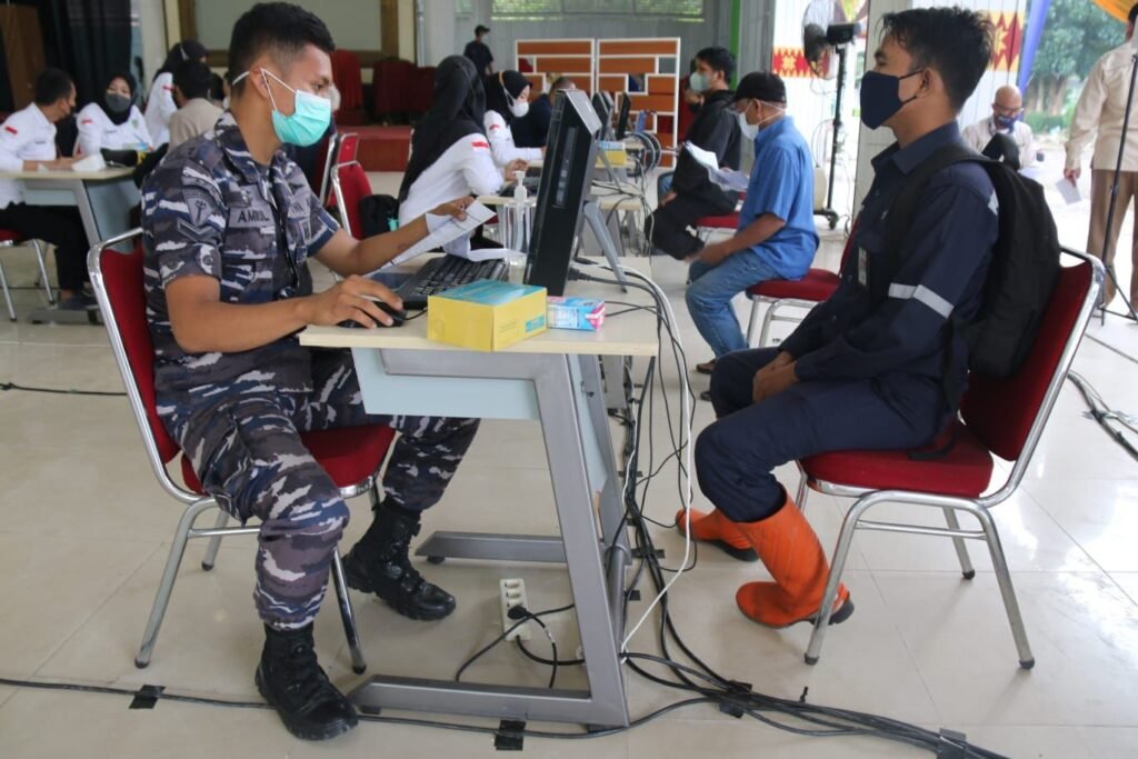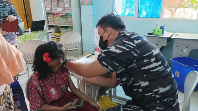 ACTUALNEWS.ID, Palembang – Tenaga Kesehatan (Nakes) Pangkalan TNI Angkatan Laut Palembang bekerjasama dengan PT. Pusri dan Polda Sumsel terus mendukung pelayanan vaksinasi Booster kepada Keluarga Besar TNI (KBT) dan masyarakat maritim mulai dari usia 6 -11 tahun dan dosis lanjutan (booster), pemberian vaksin kali ini dilaksanakan di PT. Pusri dan SMP 170 Palembang, Kamis (24/2/2022).