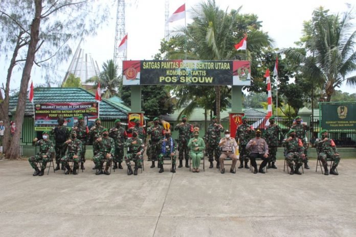 ACTUALNEWS.ID, Skouw, Jayapura – Pangdam I/BB Mayjen TNI Hassanudin, SIP, MM, didampingi Ketua Persit KCK PD I/BB Ny. Dessy Hassanudin dan Asops Kasdam I/BB, menerima paparan hasil kegiatan Satuan Tugas Pengamanan perbatasan RI-PNG Sektor Selatan Satgas Yonif 122/TS, dan Sektor Barat Satgas Yonif 131/BRS di Kotis Yonif 131/BRS Kampung Skouw distrik Muara Tami Kabupaten Jayapura, Papua, Jumat (24/9/2021).