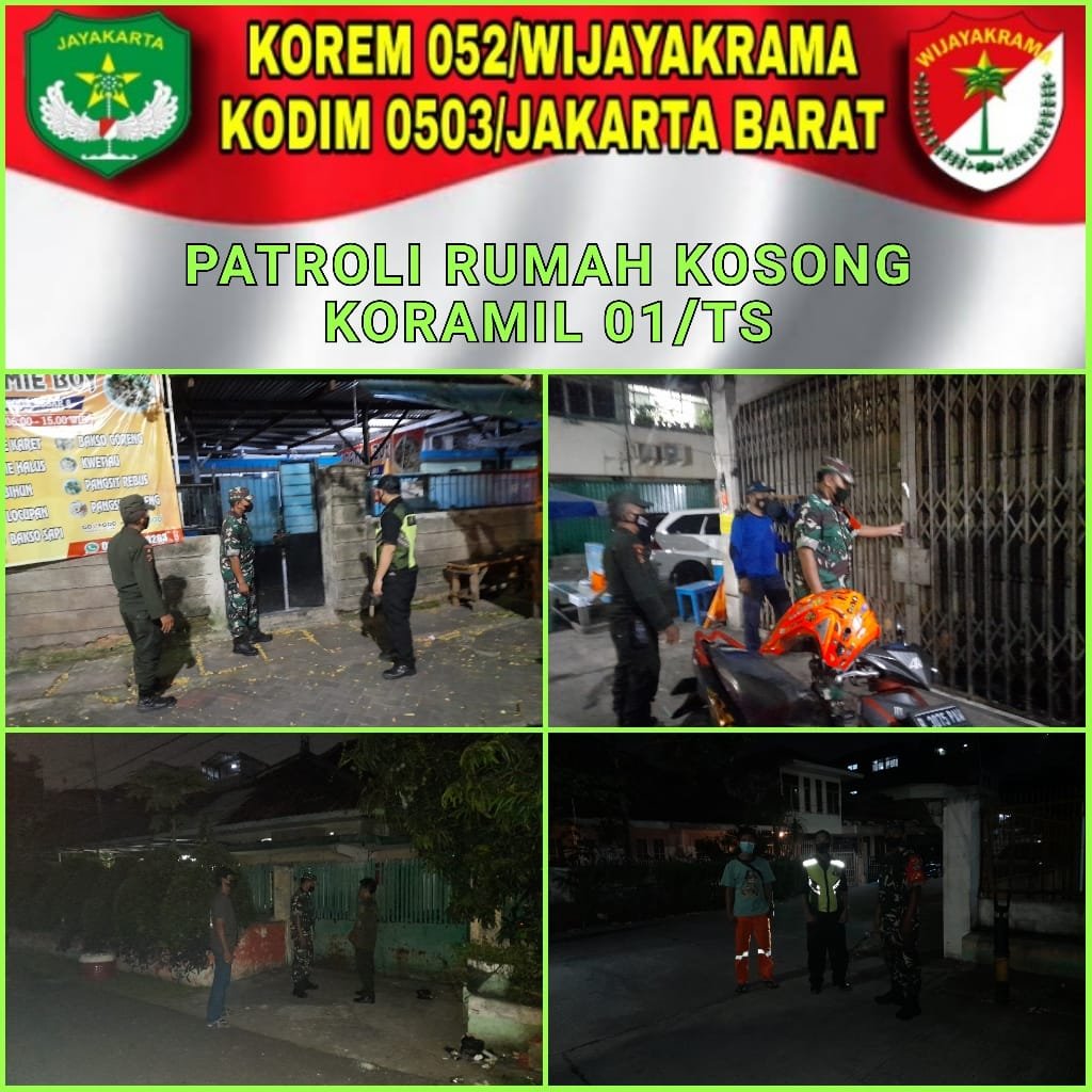 ACTUALNEWS.ID, Kodam Jaya, Kodim 0503/JB – Babinsa Koramil 01/Tamansari Kodim 0503/JB, Sertu Rusnanto pada pukul 22.00 Wib hingga selesai, Selasa 10 Mey 2022 melaksanakan patroli wilayah ke rumah-rumah kosong yang hingga saat ini pemiliknya masih berada di kampung halaman.
