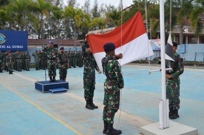 ACTUALNEWS.ID, Dumai,- Pangkalan TNI Angkatan Laut Dumai melaksanakan upacara penaikan bendera 17an yang dipimpin oleh Komandan Pangkalan TNI AL Dumai Kolonel Laut (P) Stanley Lekahena, M.Tr. Hanla., diwakili Palaksa Lanal Dumai Letkol Laut (PM) Priatno, S.H., M.H., diikuti oleh Perwira, Bintara, Tamtama dan PNS Lanal Dumai, bertempat di Lapangan Apel Mako Lanal Dumai, Jalan Yos Sudarso, Kelhan Buluh Kasap, Kecamatan Dumai Timur, Kota Dumai, Senin (17/10/2022).