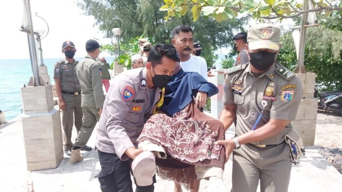 Perempuan berusia sekitar 60 tahun yang bernama Ibu Tega warga RT. 03/02 Pulau Tidung yang menderita stroke ringan kesulitan saat turun dari kapal hendak pulang ke rumahnya setelah berobat dari sebuah Rumah Sakit yang ada di Jakarta Utara langsung di papah oleh Briptu Andhika menuju ke kendaraan (bentor) untuk diantar pulang.